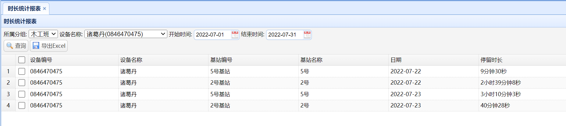 选择班组、设备、查询时间,点击查询,即可查询出每天在不同基站停留的总时长